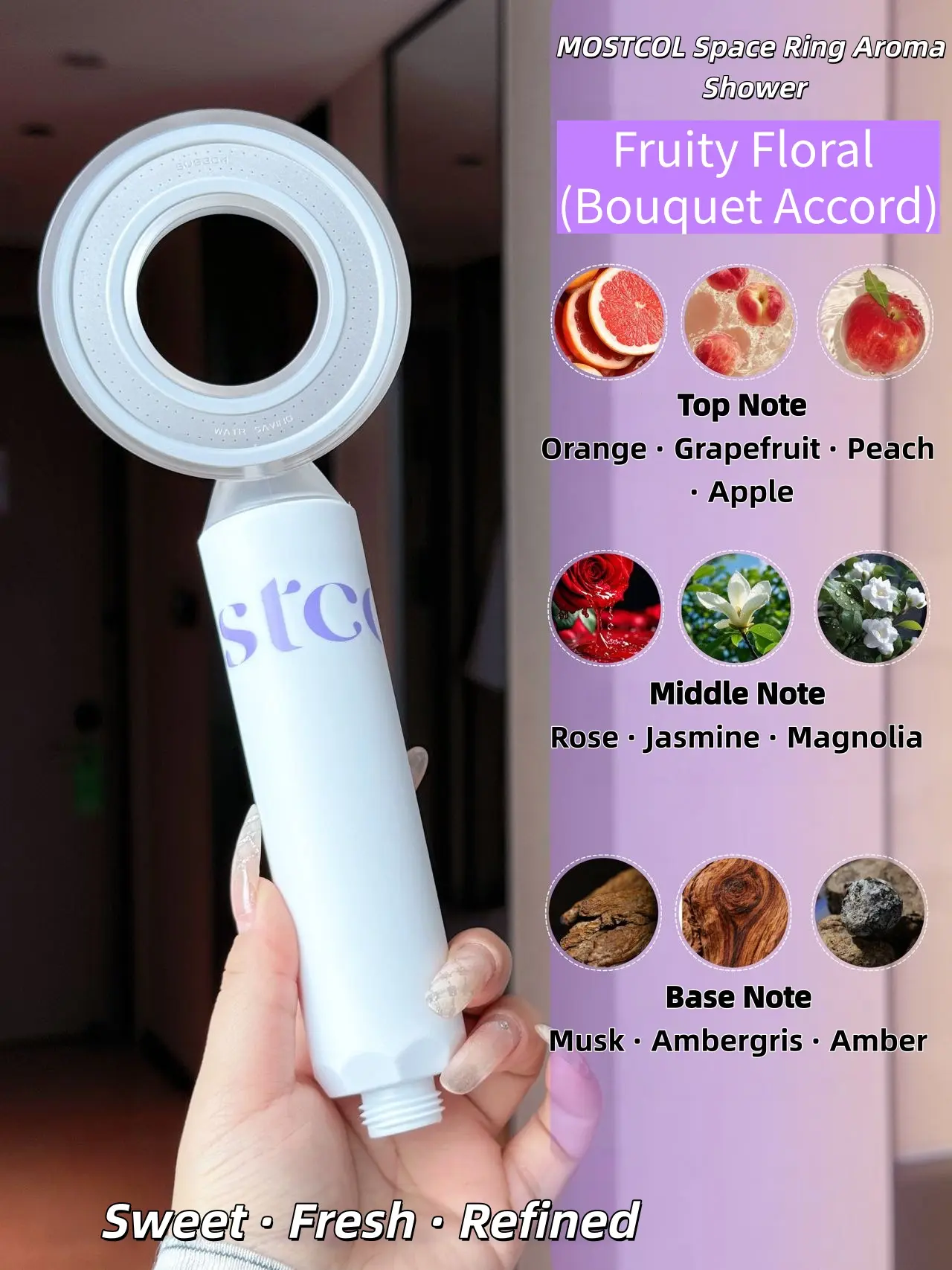 MOSTCOL’s innovative filter-free purification system achieves up to 99.9% antibacterial efficiency and 93% chlorine removal, delivering instantly purified, softer water without the hassle of replacing cartridges. Powered by its fragrance chip lock-in technology, each shower is infused with a natural, long-lasting aroma while ensuring safety through precise controlled release. More than fragrance, the chip also integrates antibacterial, skincare, and moisturizing functions, enriched with natural ingredients like chamomile, olive oil, and plant-based hydrating factors. The result: clean water, gentle skincare, and a refined aromatic atmosphere—making every shower smoother, safer, and more indulgent.
